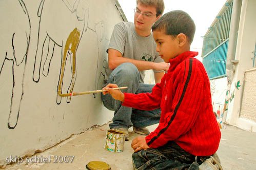 The Friends' Play Center is operated by the Ramallah Friends School, and is located in one of the several refugee camps in Ramallah. Thanks to Rosi Greenberg, kids and internationals designed and painted this mural—suggesting their dreams, not their reality.